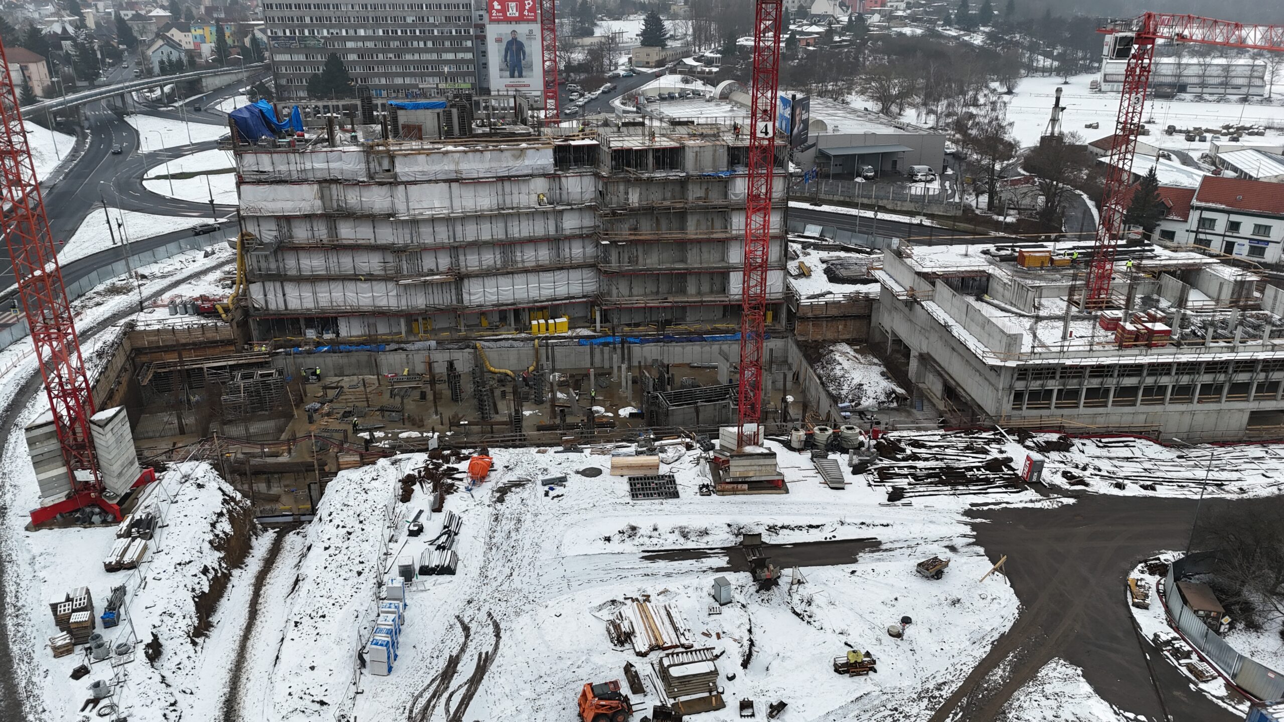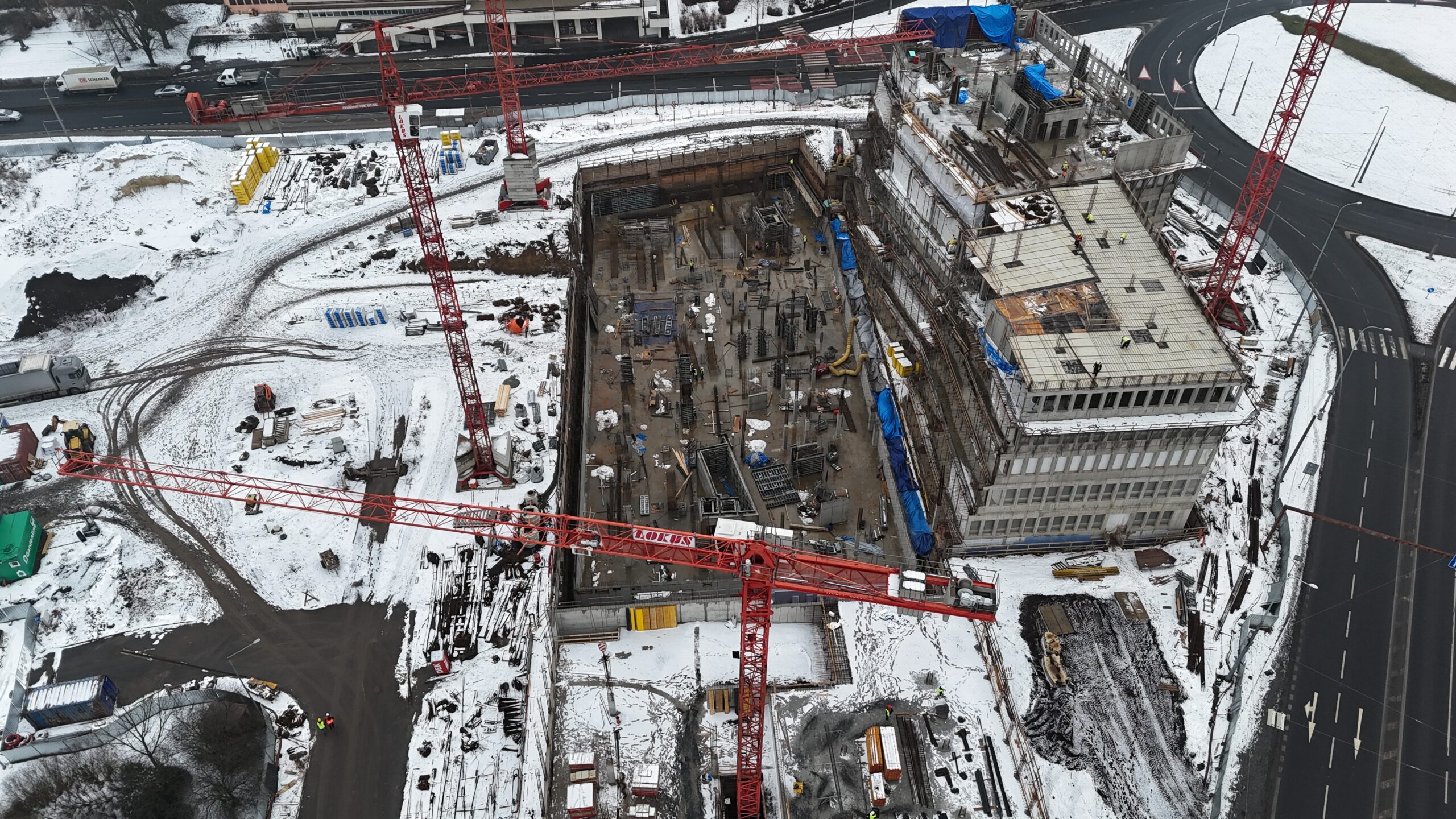 Výstavba Justičního paláce v Ústí nad Labem postupuje na všech částech areálu současně – dokončuje se část hlavní budovy B a parkovacího domu C, zatímco v administrativní budově A a druhé části objektu B pokračují betonáže druhého podzemního podlaží. Navzdory zimním podmínkám probíhá stavba podle harmonogramu, což umožnila dočasná opatření zahrnující vytápění interiérů a zakrytí stavebních otvorů, aby mohly pokračovat zednické a betonářské práce. V těchto týdnech probíhá armování stěn a příprava bednění napříč všemi objekty. Projekt doprovázel rozsáhlý archeologický výzkum, který odhalil pozůstatky čtrnácti mamutů srstnatých, nosorožce srstnatého a dalších velkých pleistocenních zvířat, díky čemuž se lokalita zařadila mezi významné naleziště ve střední Evropě. Tento nález ovlivnil nejen průběh, ale i cenu stavby, přesto práce pokračují stabilním tempem a směřují k dokončení v roce 2028, kdy komplex poskytne moderní zázemí soudům, státnímu zastupitelství i dalším institucím justice.